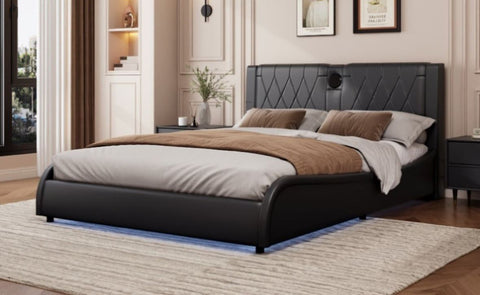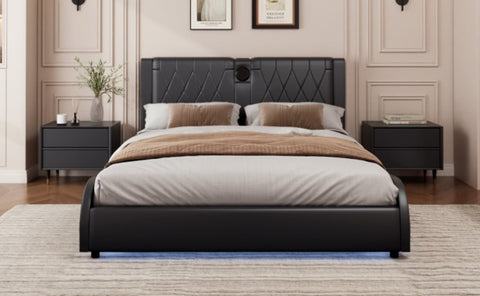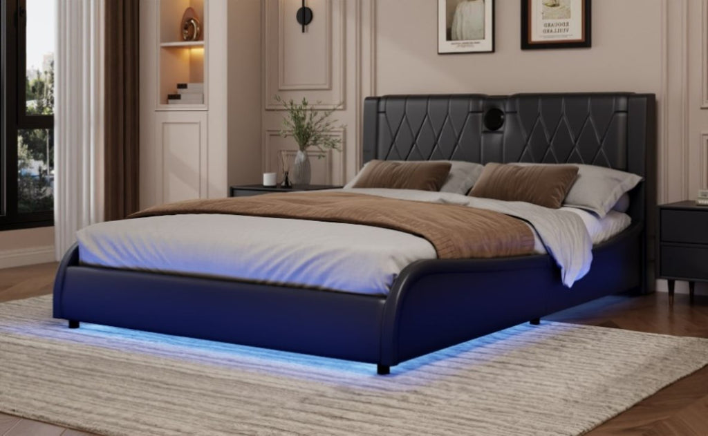 Transform your bedroom into a futuristic haven with our RGB LED Leather Upholstered Bed. Featuring a luxurious thickened PU leather headboard and integrated Bluetooth speakers, this bed offers both comfort and high-tech convenience. The adjustable RGB LED lights set the mood, while the Bluetooth speakers let you enjoy music wirelessly. Easy to clean and maintain, this bed is designed for those who want a stylish yet functional addition to their bedroom