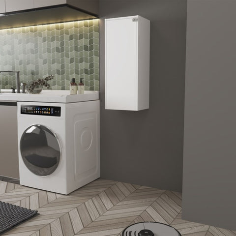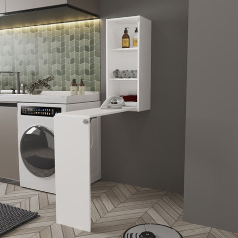 "This wall-mounted folding table is a practical and space-saving addition for living rooms, laundry rooms, or multipurpose spaces. Its fold-out design creates a functional surface for tasks like folding laundry or organizing items and can be easily folded away when not in use. The integrated shelving provides convenient storage for essentials or decorative items, making it a versatile and stylish solution for optimizing your space. Materials: Particle board and melamine. Dimensions: 66,4"" (H) x 13,7"" (W) x 42,6"" (D)."""