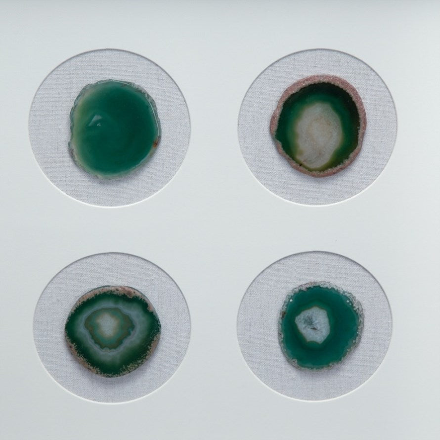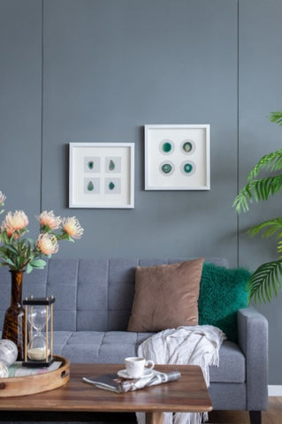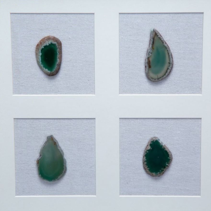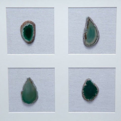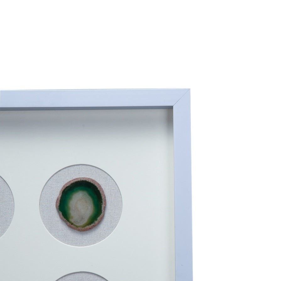 The contrast of the agates against the white background frame make this wall decor the perfect addition for a minimalist office or modern art installment.