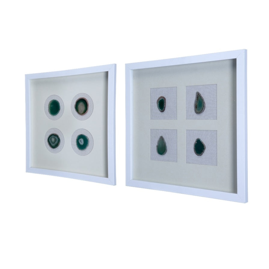 Add the Set of 2 Coty Shadow Box Wall Decor features four slices of agate to add a organic element to the design. The contrast of the agates against the white background frame make this wall decor the perfect addition for a minimalist office or modern art installment.