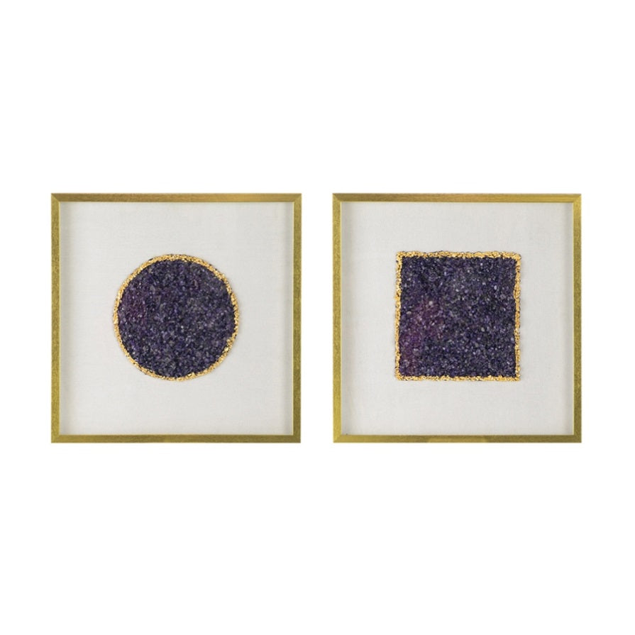Accent any wall or bookcase with the Set of 2 Lillian Purple Crystal Shadow Boxes. The textures and purple coloring of the crystal bring a welcoming organic element the to design. Encased in neutral frame with a thin gold band and displayed on an ivory velvet fabric, adds the finishing touch to the decor.