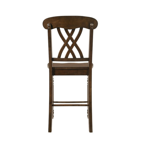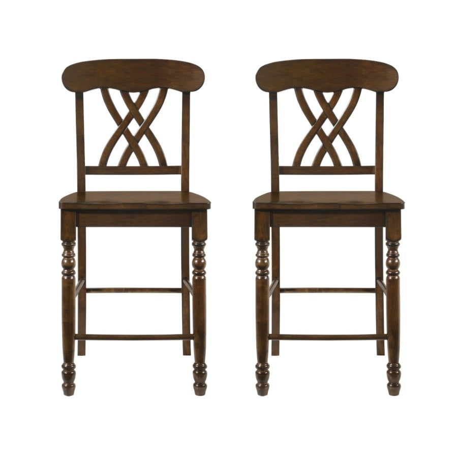 Put a decorative spin on your counter height dining ensemble with this set of two wood side chairs. They help create a more open, airy and casual look in your dining space. In walnut finish creating a country farmhouse look. The chairs feature a scooped seat and overlapping XX design on the backrests.
