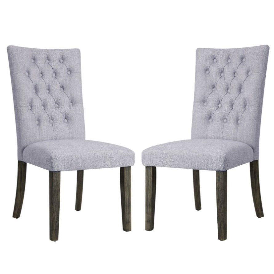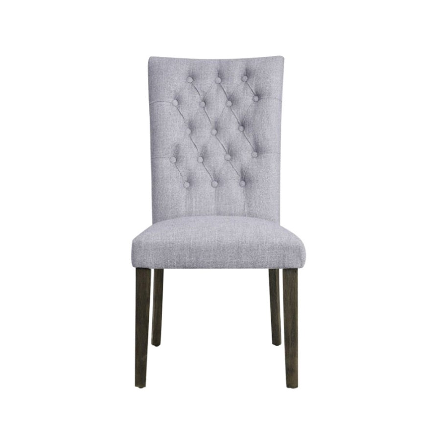 Attract attention to your dining room with the side fabric chairs. Featuring a stunning button tufted gray backrest and classic gray oak finish wood legs, this chair is both durable and stylish, complementing your contemporary home decor theme while guaranteeing to withstand the wear and tear of daily use for years to come. A striking mix of natural materials this unique chair will provide comfortable seating for all of your guests.