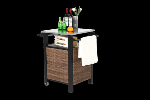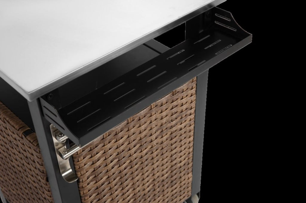This rattan outdoor kitchen table features a solid steel frame that's covered in weather-resistant handwoven wicker; Stainless steel countertops are better for outdoor use; Can withstand diverse weather conditions to achieve long-lasting use