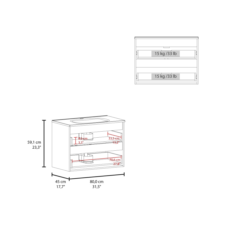 Two spacious soft-close drawers provide organized storage for toiletries, towels, and essentials