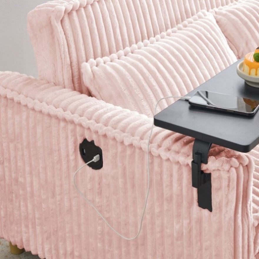 The fabric of the sofa is made of high-quality pink corduroy, making you feel as if you're surrounded by all the tenderness in the world. Its unique pull-out and push-in design is truly remarkable. With smooth rollers installed at the bottom, you can easily slide the sofa out with just a gentle push and instantly turn it into a spacious and comfortable bed, breaking the functional limitations of traditional furniture with its flexible and changeable features.One side of the armrest is cleverly equipped with a movable tabletop, allowing you to enjoy a meal while binge-watching your favorite shows or handle urgent work tasks when working from home. Additionally, a USB port is thoughtfully placed on the right side of the sofa. So when you're lying on the sofa watching dramas or playing games, you no longer have to worry about your phone running out of battery. You can charge it at any time and enjoy uninterrupted entertainment, fully immersing yourself in a cozy and relaxing leisure time.