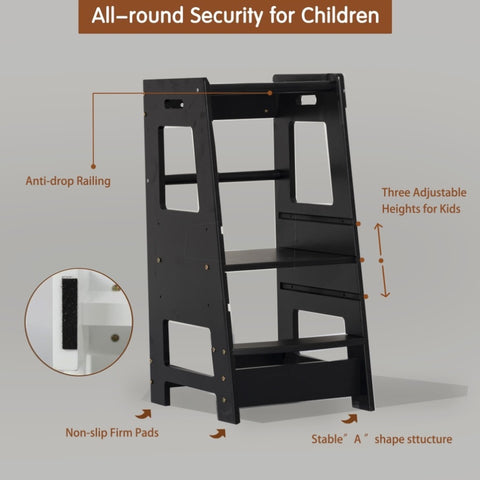 ALL-ROUND CONSIDERATE SECURE: When shopping for a step stool, safety is paramount.Learning Stool Tower offer great protection to kids. Thanks to an innovative railing that surrounds the child on all four sides, providing enough protection to prevent falls.The multi-layer surrounding rails provide all-round protection for kids, and the anti-drop design makes it safe and secured for kid no matter which direction they face
