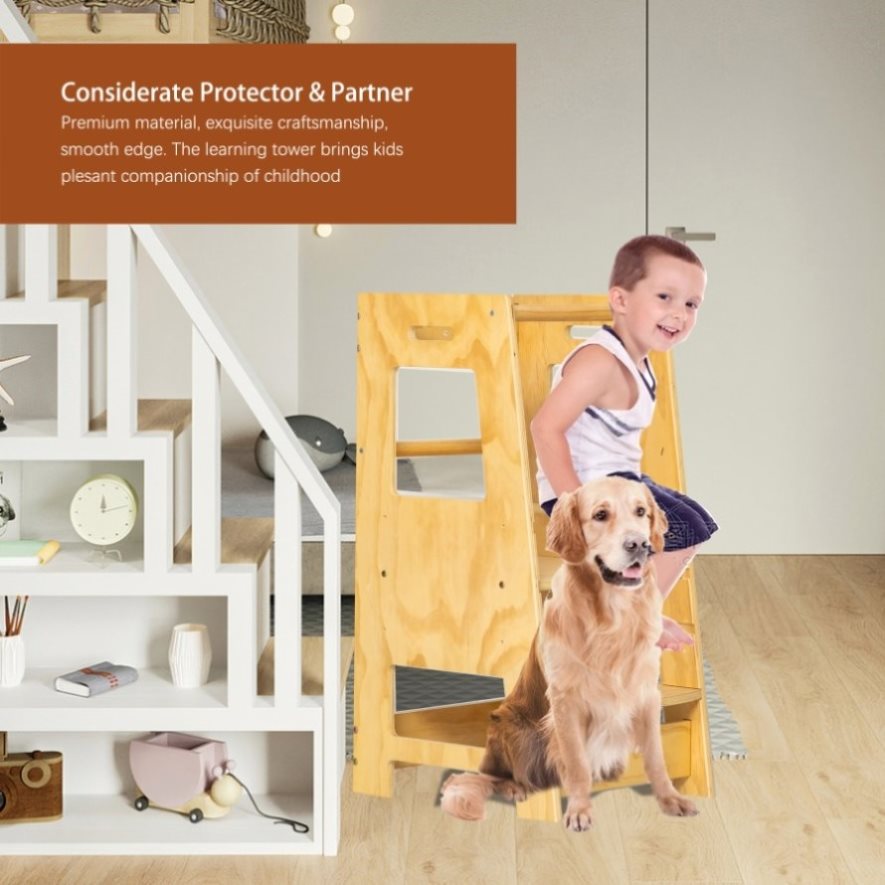 ALL-ROUND CONSIDERATE SECURE: When shopping for a step stool, safety is paramount.Learning Stool Tower offer great protection to kids. Thanks to an innovative railing that surrounds the child on all four sides, providing enough protection to prevent falls.The multi-layer surrounding rails provide all-round protection for kids, and the anti-drop design makes it safe and secured for kid no matter which direction they face