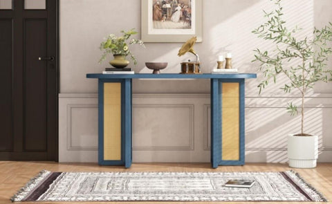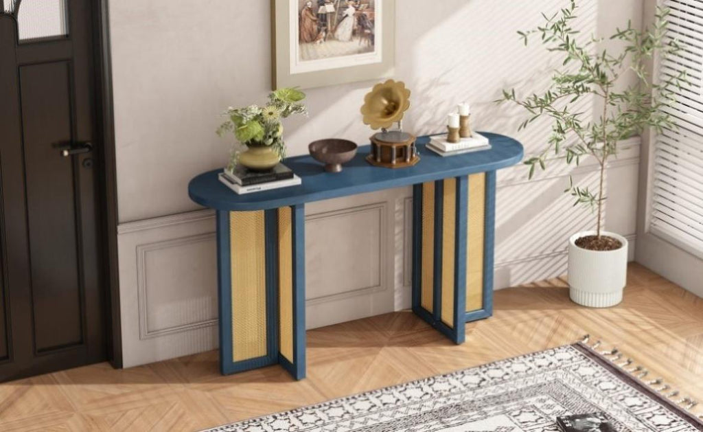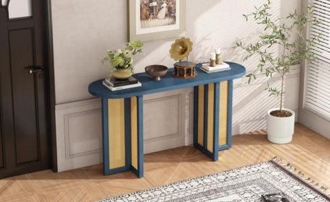 Console Table with Rattan Elements: The oval tabletop is designed with solid wood grain, small knots and textures are naturally occurring and add character to each piece. Combined with the exquisite rattan weaving of the table legs, which adds an elevated feel to the design. This multi-purpose console table is suitable for placing in living room,dinning room, hallway and entrance.