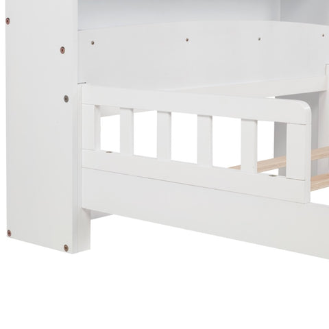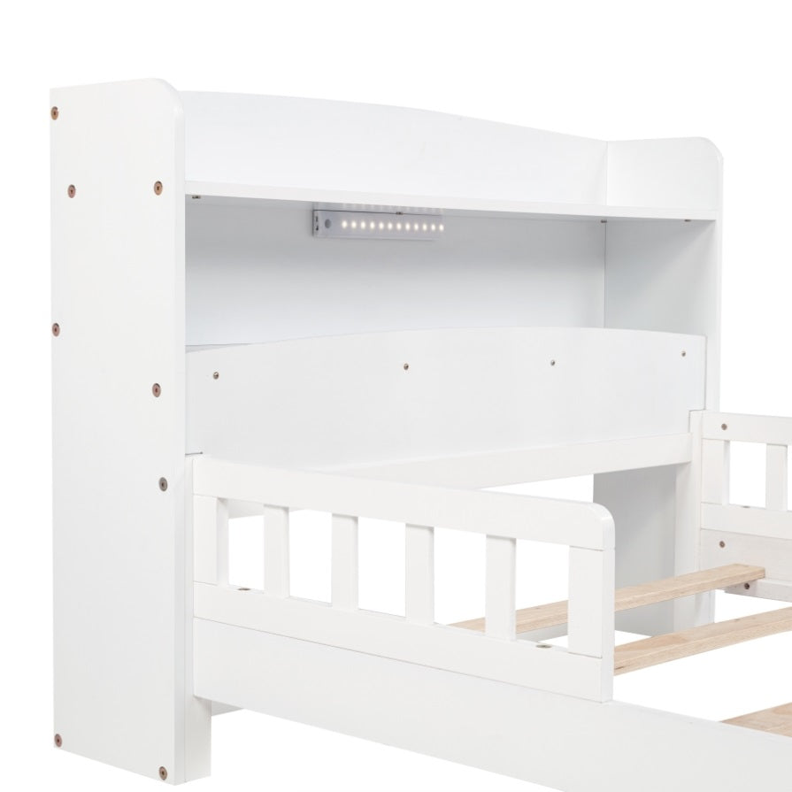 Twin Pine Wood Bed with Bookcase Headboard ,LED Motion Sensor Light, Guardrails,White W504P277596