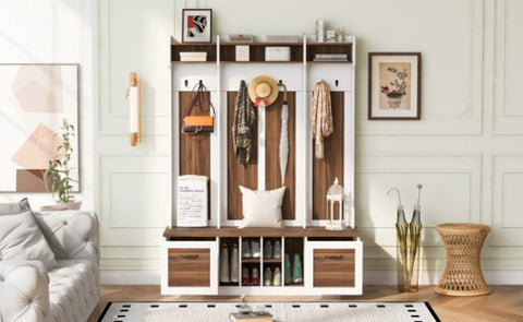 This two-tone hall tree combines modern aesthetics with practical functionality, making it an excellent addition to your home. Measuring 58.8 feet in length, 17.7 feet in width, and 17.1 feet in seating depth, it is an ideal solution for organizing and enhancing your entryway, living room, or walk-in closet.