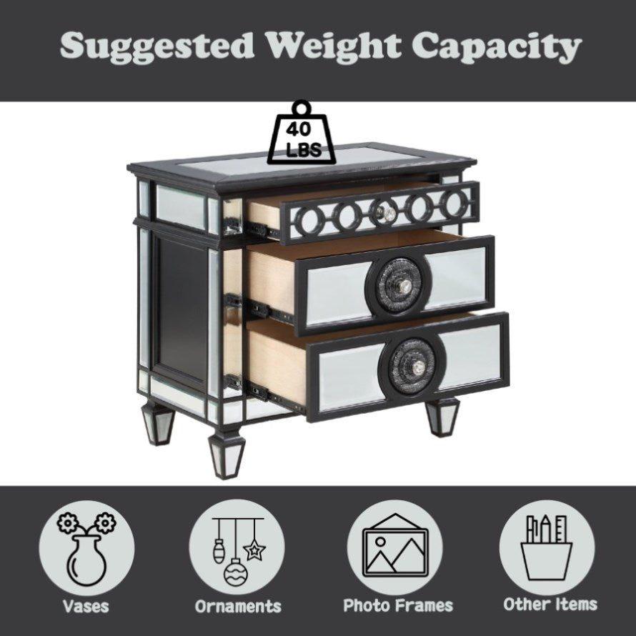 2 Drw, Mirrored Top, Raised Geometric Trim, Sunburst Motifs, Drawer: Glide Side Metal (3/4 Ext.)