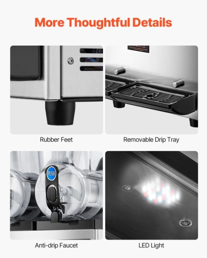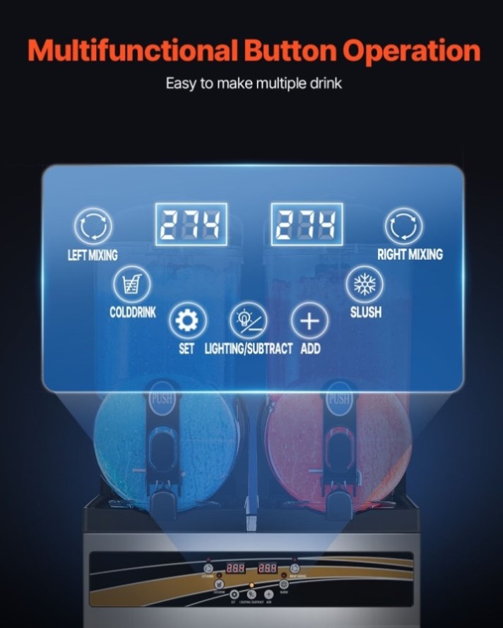 2 Tanks Independent Settings: With two 15L / 3.96 GAL capacity tanks, this slushy machine can make approximately 120 cups of slushy drinks per batch, you can choose to use each tank independently. It requires less frequent refilling, making it perfect for high-traffic commercial use. The transparent tank beautifully showcases colorful drinks, making it a great fit for ice cream shops, burger joints, cafes, bars, and other commercial settings.