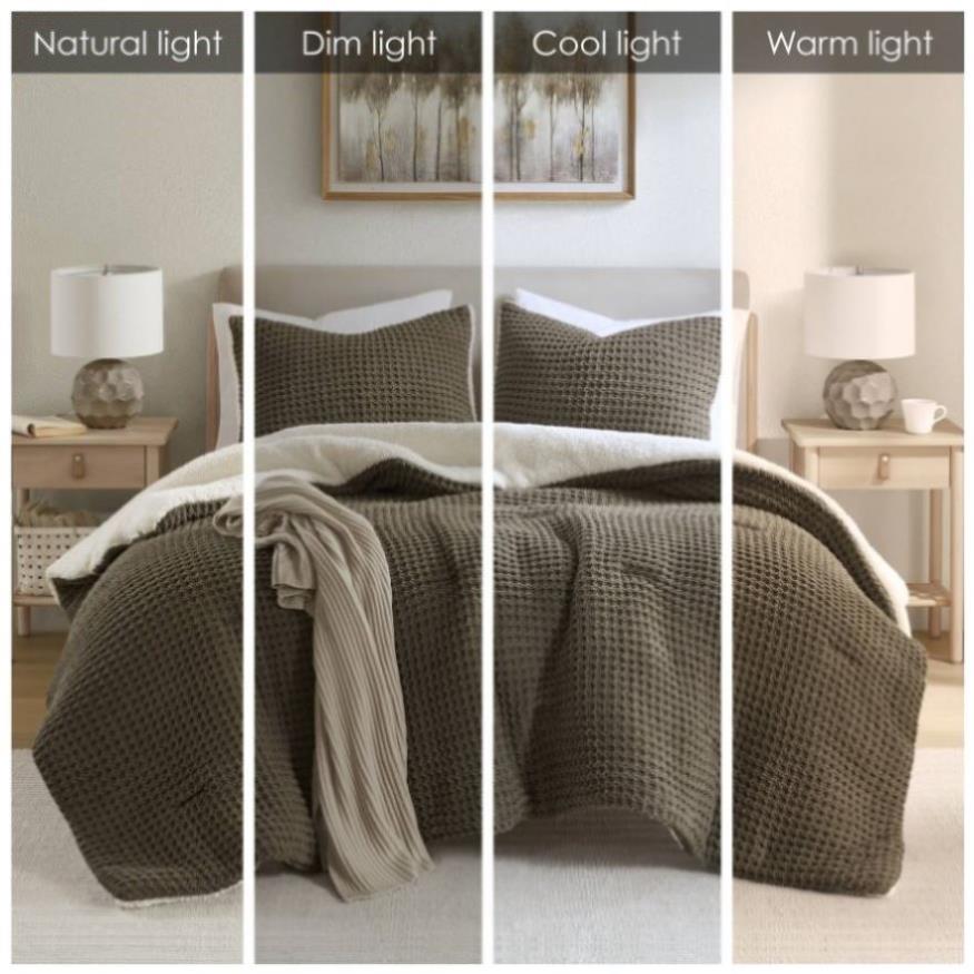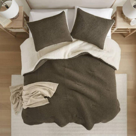 Comforter/Sham: 100% polyester feather chenille waffle knit, ivory sherpa reverse