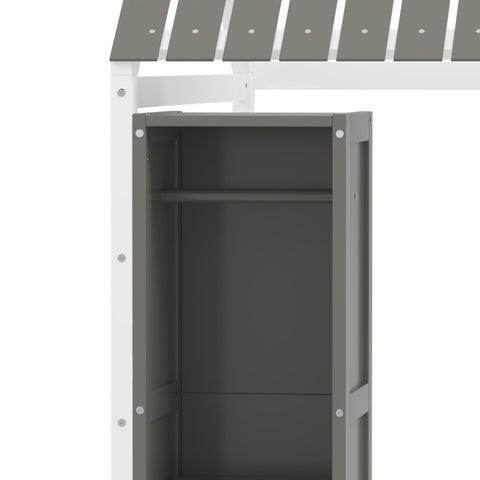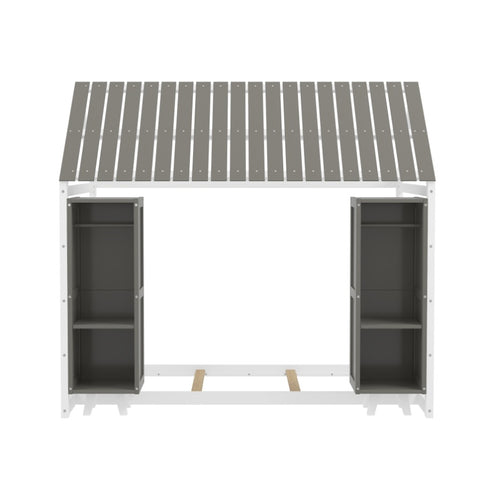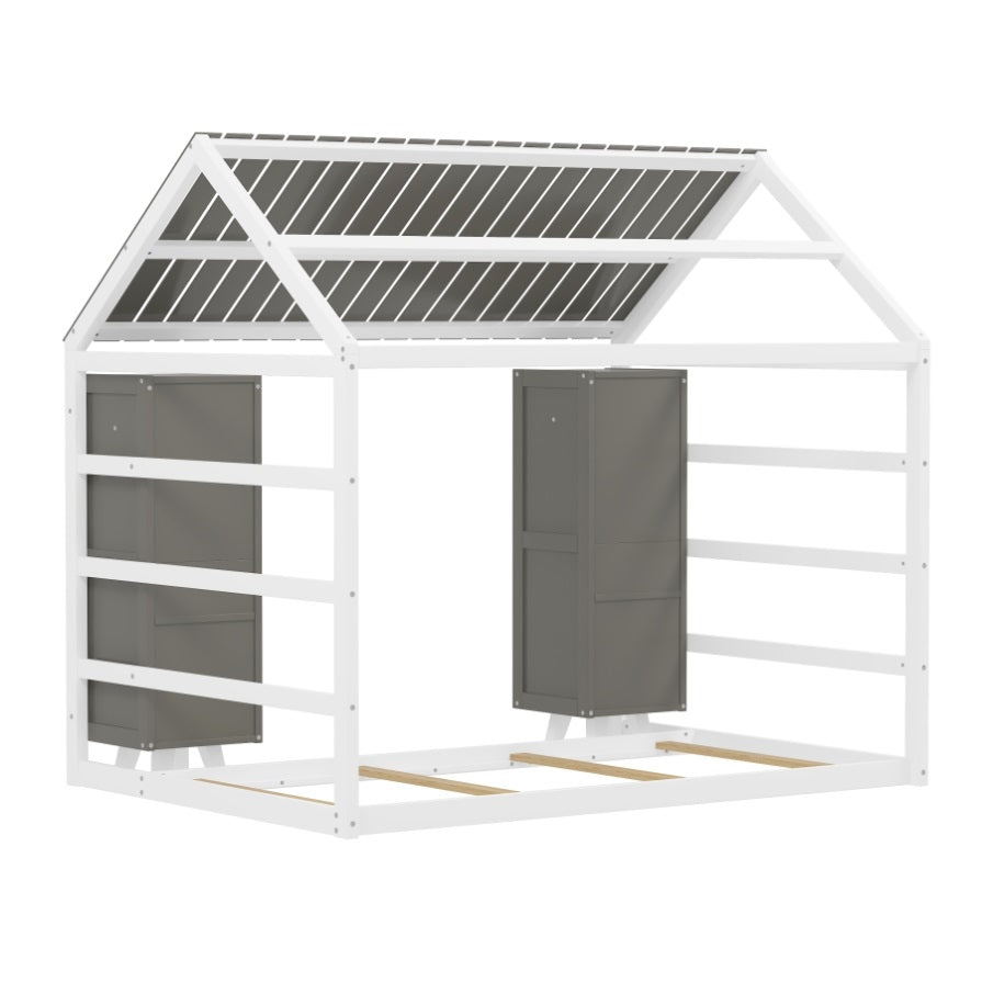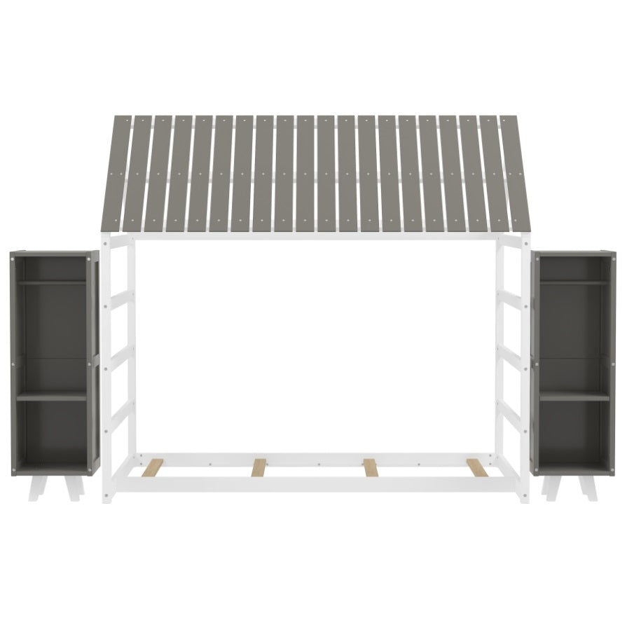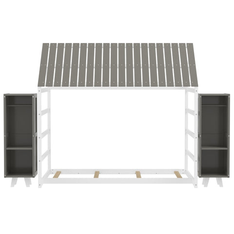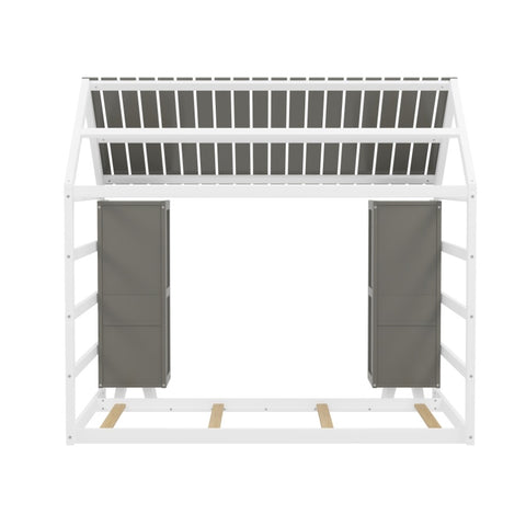 Wooden Twin Size House Bed with Fence and Roof, Kids Floor Bed with Two Movable Wardrobes, Gray N733P240134E