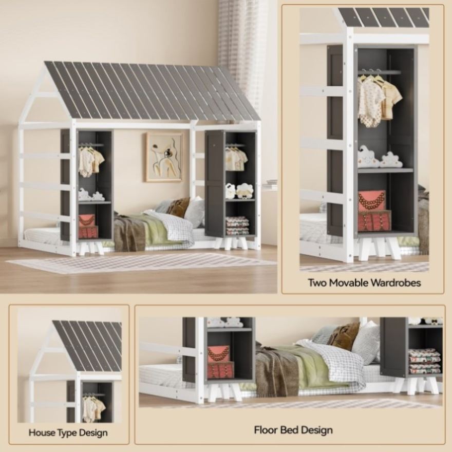 Wooden Twin Size House Bed with Fence and Roof, Kids Floor Bed with Two Movable Wardrobes