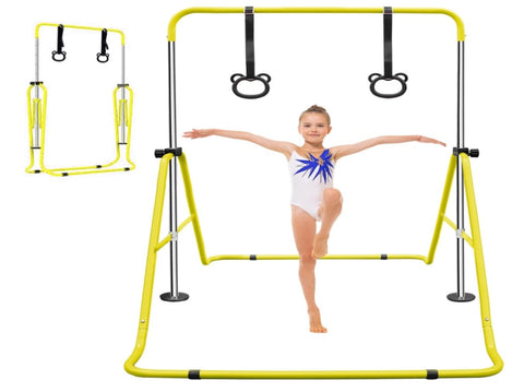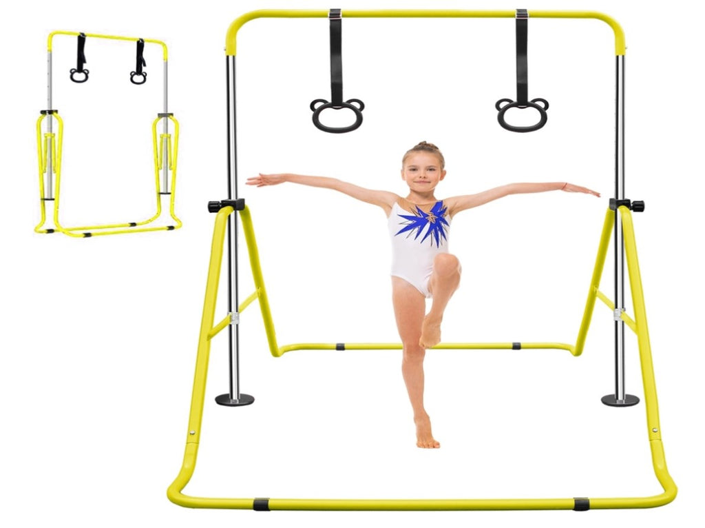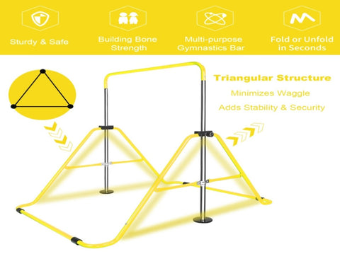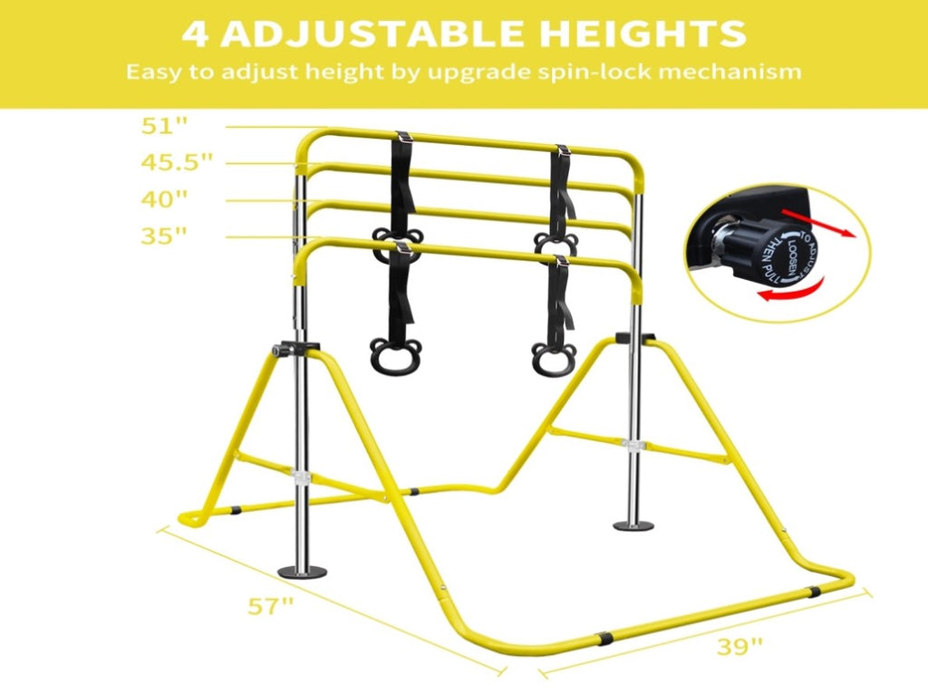 Sturdy Construction:This Gymnastic Bar is foldable steel,tight hinge,anti-rust,high durability.The round pedestals is for better gripand stability.And the lock mechanism is easy to adjust height.The rubber rings is for better grip and slip resistance.The adjustment holes can meet different needs and skill levels.Adjustable heights from 34.8 inches to 51 inches, suitable for 99.99% of children.