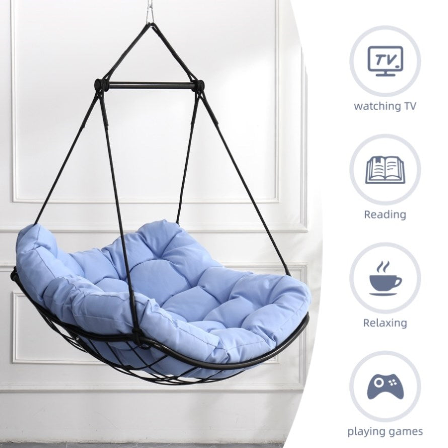 DURABLE MATERIAL: Our sling chair frame is powder coated in black. Equipped with waterproof cushion, which can ensure the durability of the hanging chair, with swivel ring can be turned 360 degrees, 1.2 meters long chain can help you fully adjust the height of use.
