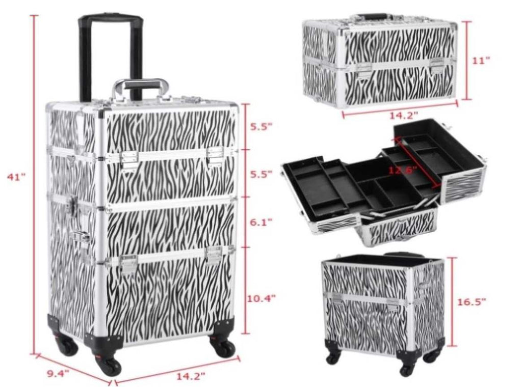 3. Overall Trolley Makeup Case with Handle and Casters Dimensions: (14.17 x 9.45 x 40.94)" / (36 x 24 x 104)cm (L x W x H)