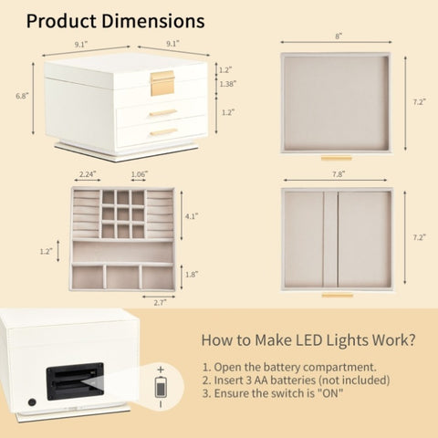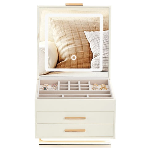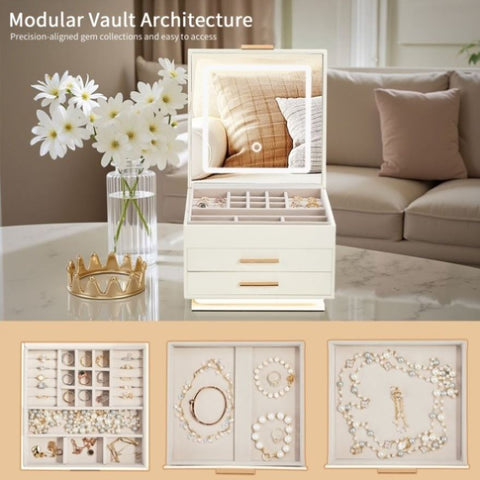 Features a built-in 3-color adjustable mirror LED light (warm/white/cool) for perfect jewelry viewing, plus a soft bottom ambient light strip for a luxurious glow.