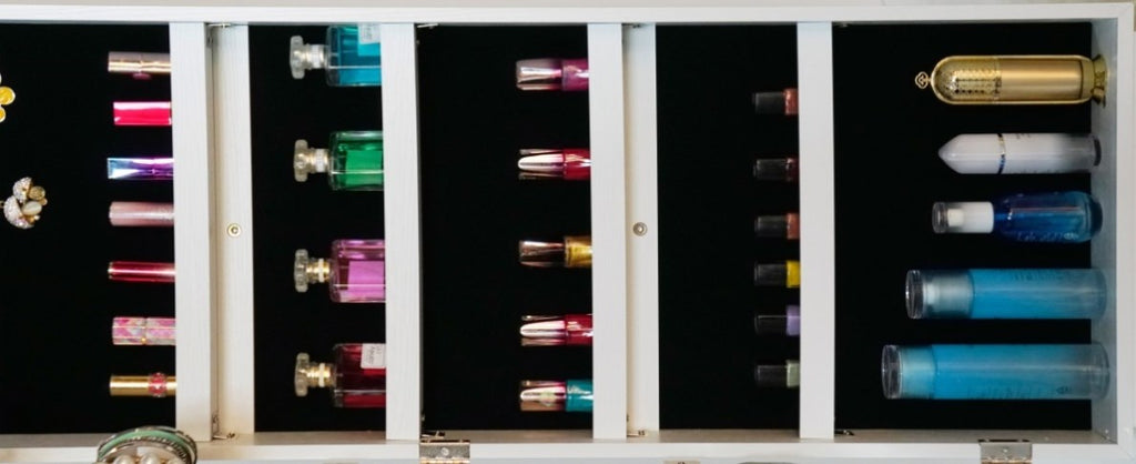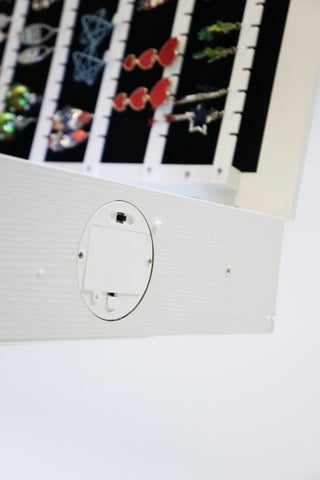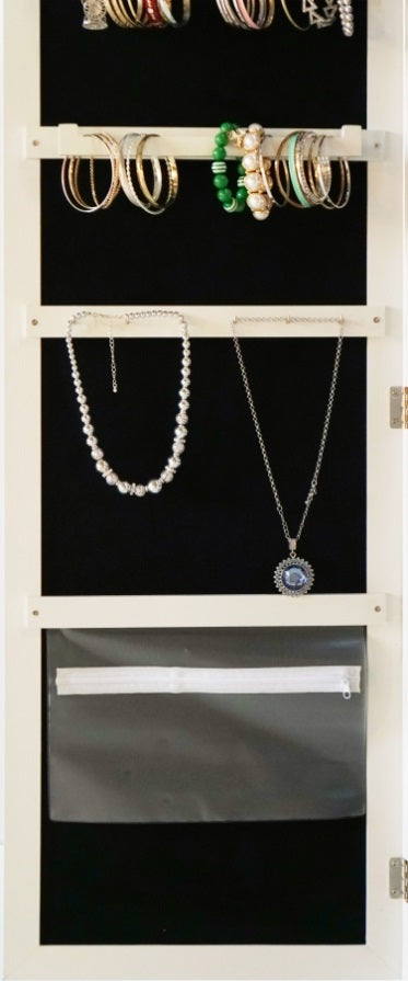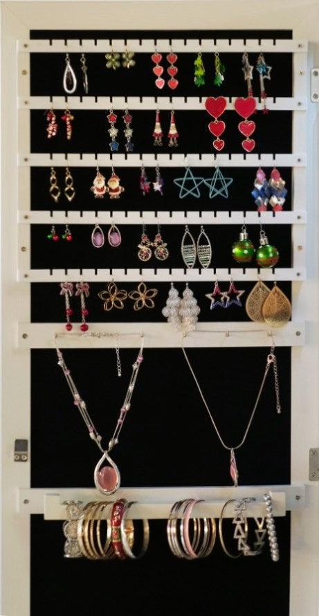 Ample storage:includes 22 necklace hooks,2 cubes,4 lined shelves and a bracelet rod,and plenty of room for rings and eqrrings.it can hold on the door or wall.
