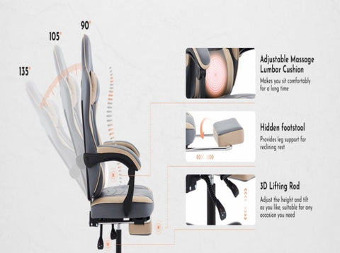 Versatile And Adjustable: The gaming chair includes an adjustable headrest, a seat height adjustment range of up to 4 inches, and retractable foot supports to meet the needs of users of different heights. The back of the chair can be adjusted to 90°, 105°, and 135°, so you can find the ideal Angle for work, play, or relaxation. The chair also has silent wheels to make the movement smoother and quieter for the best comfort experience