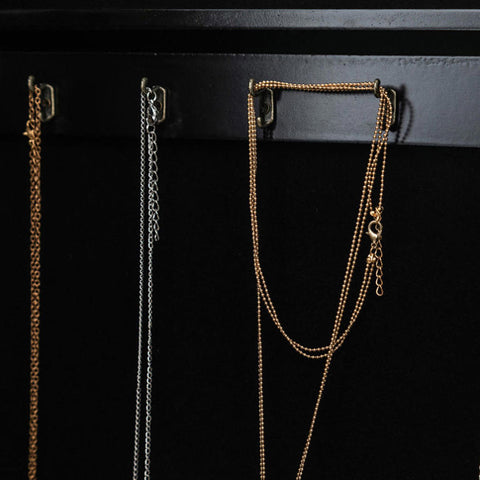 2. Large storage space and various storage structures. On the left side of the cabinet, there are 120 ear ring slots, a bracelet bar, 24 retro necklace hooks, while on the right side, there are 78 ring slots, 6 retro hooks, plus a cloth bag to improve storage capacity. The spacious closet can easily tidy and keep all your jewelry in good condition