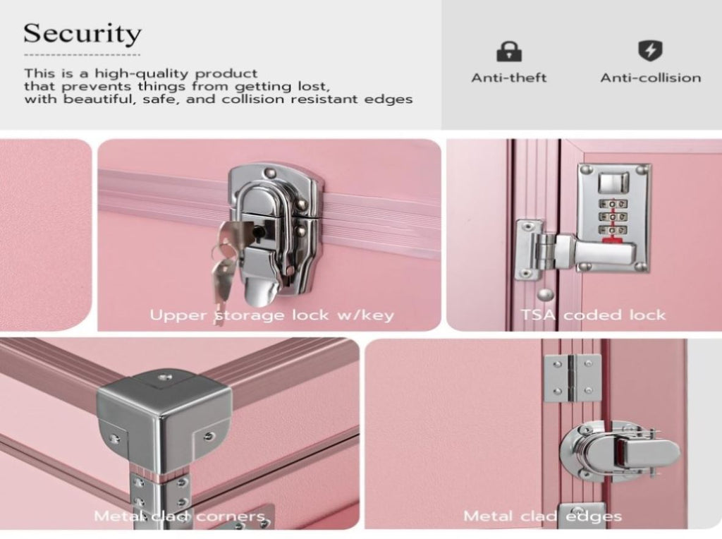 Security: Storage areas have locks to prevent theft. TSA locks on the drawer also make it easier to customs check. The corners of the case are protected by metal trim to avoid knocks on the move
