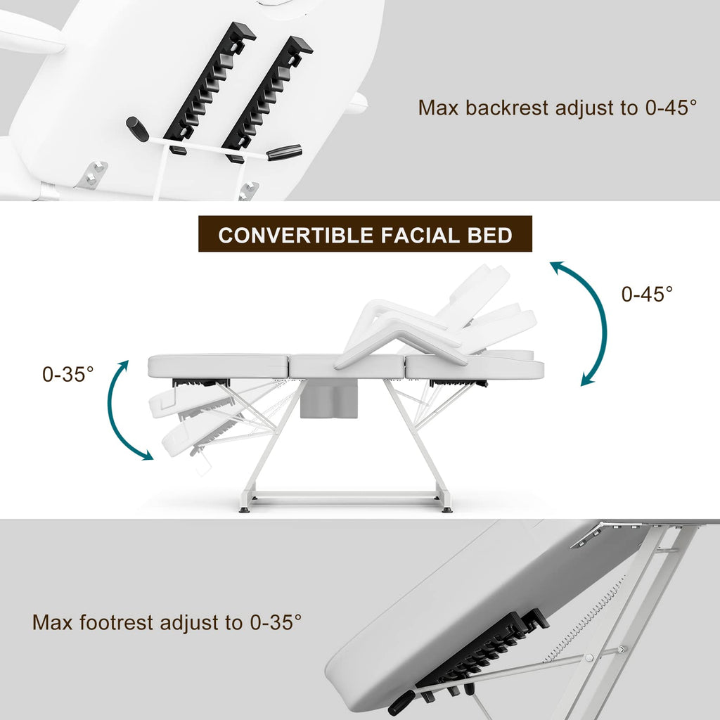 • 【Adjustable Backrest & Footrest】Our massage bed has backrest and leg rest that can be adjusted separately and fold flat. The maximum adjustable angle of the backrest is 45°, and the footstool can be tilted to 35°. Removable head cushion with face hole facilitates free massage postures conversion.