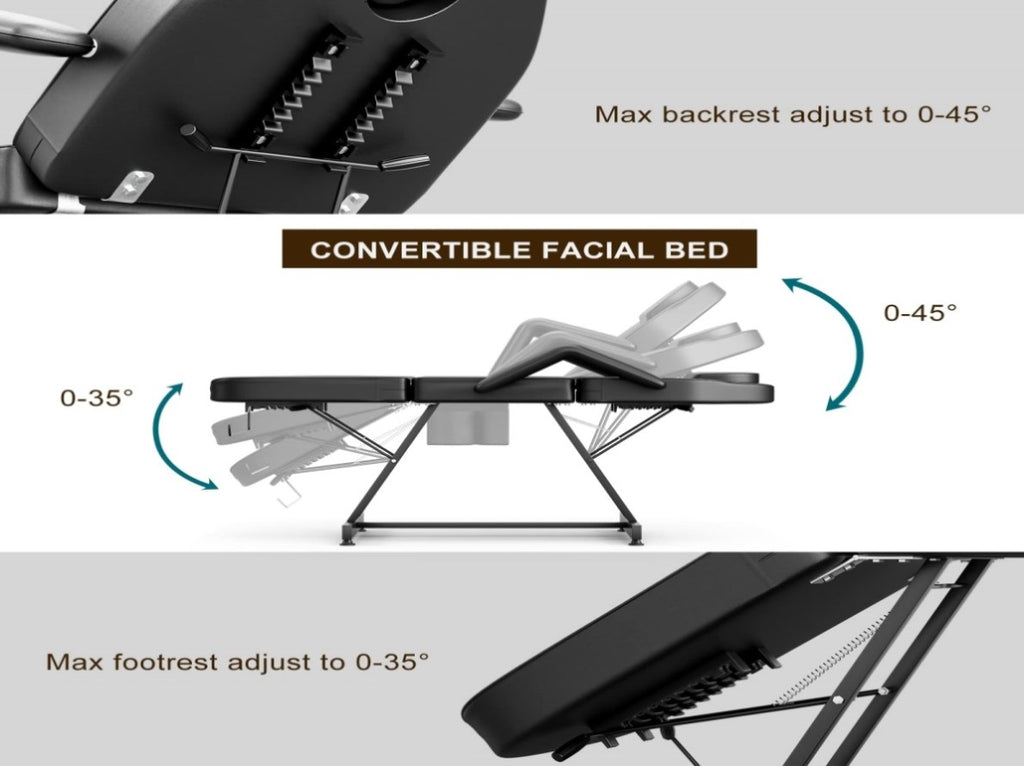 • 【Adjustable Backrest & Footrest】Our massage bed has backrest and leg rest that can be adjusted separately and fold flat. The maximum adjustable angle of the backrest is 45°, and the footstool can be tilted to 35°. Removable head cushion with face hole facilitates free massage postures conversion.