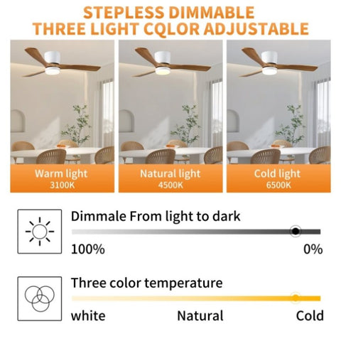 Color-changing& Dimmable LED Light Flush mount modern ceiling fan with color-changing light (3100K warm yellow light, 4500K bright daylight, 6500K cool white light), dimmable from 0%-100%, create desired atmosphere for working, leisure, party.