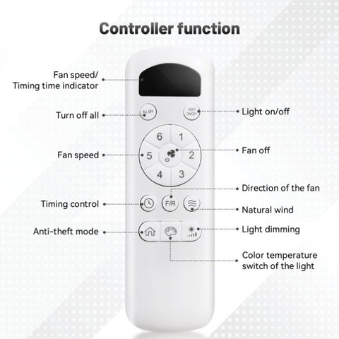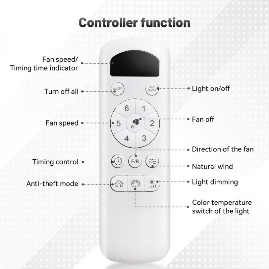 The ceiling fan light has a built-in 22W LED light source that allows for three color dimming functions. You can choose soft warm white light, bright white light or cool white light according to their needs, creating the ideal atmosphere for different scenes.