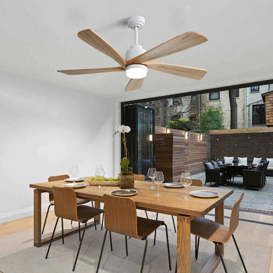 Solid Wood Blades: This stylish ceiling fan’s blades have a swept diameter of 52 inches. Made from solid wood to help ensure efficient, quiet air delivery. Wooden blades are combined with a simple, high-performance DC motor for low noise and energy-efficient cooling.