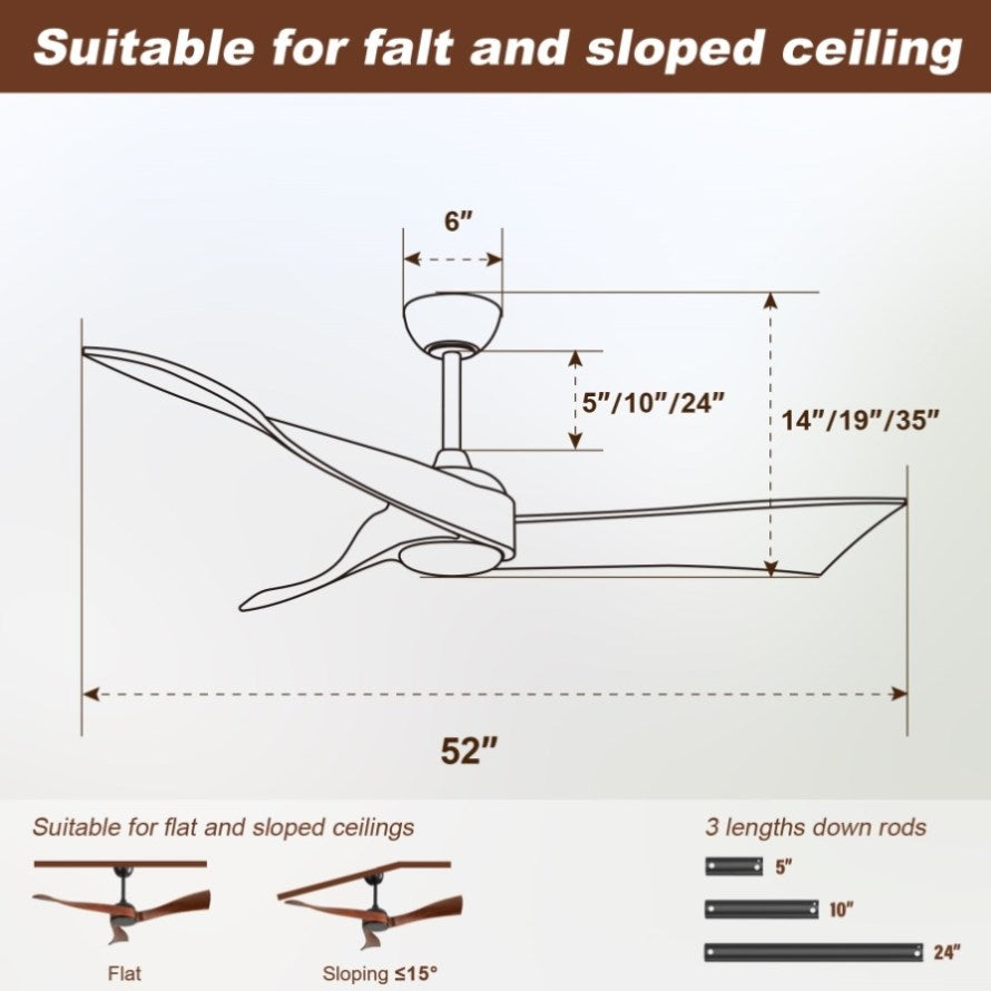 The 52-inch modern wood ceiling fan is simply and beautifully designed to complement any room decor, perfect for those who want to add a touch of sophistication and elegance to their home or outdoor space, suitable for a patio, gazebo, living room, bedroom various places. Also features high-quality solid wood leaves that are both durable and long-lasting.