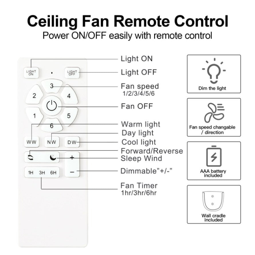 Easy Control Function: use the remote control to adjust the fan speed and dim the light