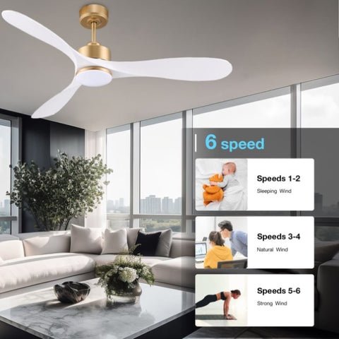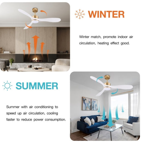 【Quiet Reversible DC Motor】 6-speeds modern gold and white ceiling fan delivers airflow up to 4356 CFM. Indoor outdoor ceiling fans with dc motor keep room cool under 30dB, no hum and no wobble, 75% more energy-efficient. Reverse allows summer downdraft mode and winter updraft mode.