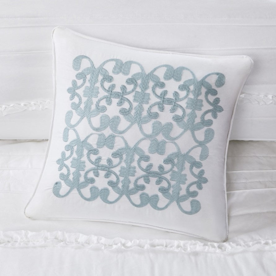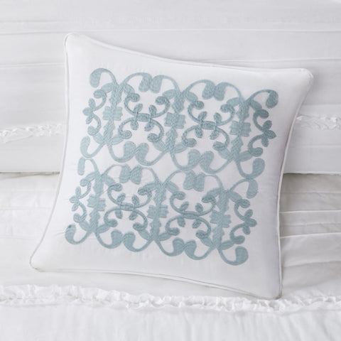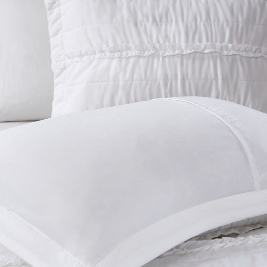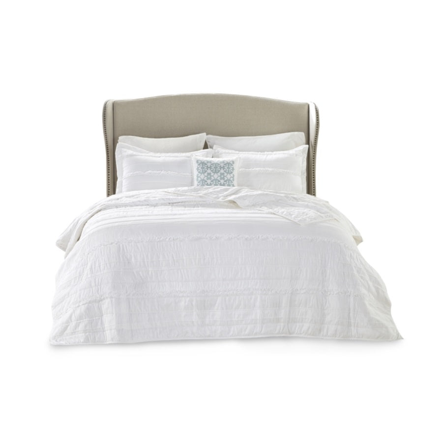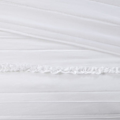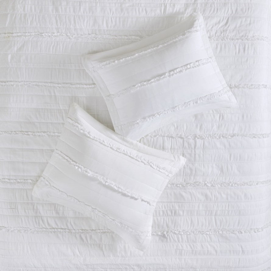 Create a shabby chic look in your bedroom with the Madison Park Celeste Collection. This solid reversible white quilt has ruffles and quilting paired with a contrasting embroidered decorative pillow for a clean update for your space.