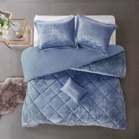 Create a luxuriously comfortable bedroom space with the Intelligent Design Felicia Velvet Duvet Cover Set. The periwinkle blue crushed velvet duvet cover features a quilted diamond top that adds dimension to the glamorous look. Matching shams (1 for Twin/Twin XL) coordinate with the velvet duvet cover, while an oblong decorative pillow provides a perfect finishing touch. Machine washable for easy care, this velvet duvet cover set brings incredible softness and comfort with a luxurious flair to your bedroom décor. Button closures allow you to place a comforter insert within the duvet cover and internal corner ties help prevent it from shifting (Insert is NOT included).