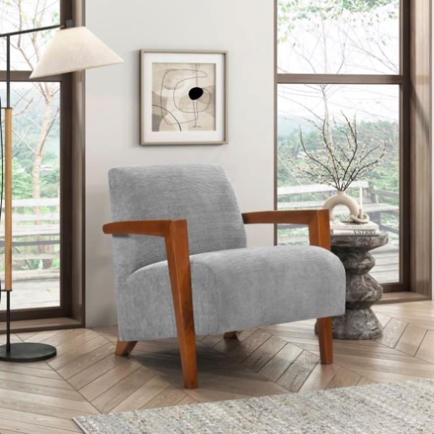 Introduce a touch of mid-century modern charm and exceptional comfort to your living space with this gray chenille armchair. Featuring a sturdy solid wood and plywood frame, a dacron wrapped foam seat cushion, and soft chenille fabric upholstery, this chair offers both durability and a luxurious seating experience. The solid wood arms and legs in a rich chestnut finish provide a warm, elegant foundation. With a 300lb weight capacity and easy assembly, this armchair is perfect for enhancing your living room, bedroom, or reading nook with a blend of style and practicality.