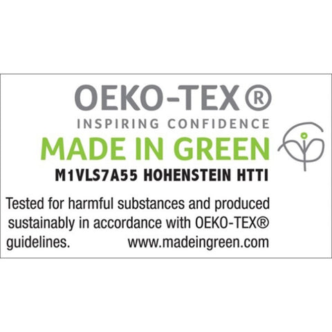 Made in Green by Oeko-Tex Certified, includes no harmful substances or chemicals while also using sustainable processes and socially responsible working conditions