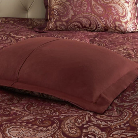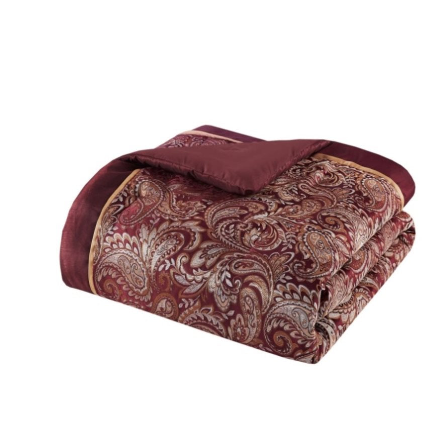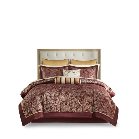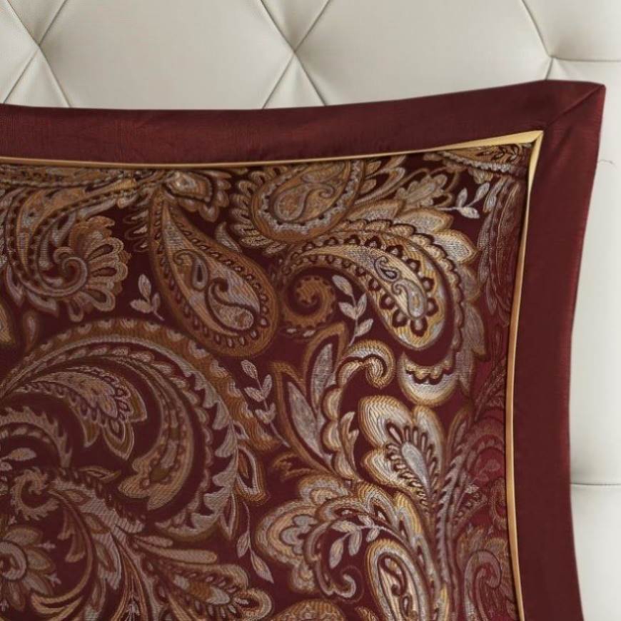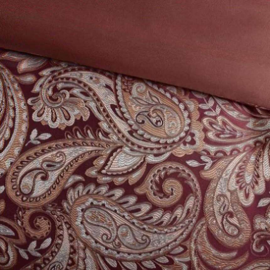 Give your bedroom a classic and elegant look with the Madison Park Aubrey 12 Piece Complete Bed Set including cotton bed sheets. This stunning set features a jacquard weave with a modern paisley pattern in a burnt red, gold and a hint of silver for a touch of sheen to your bedding. The comforter and shams have a 2" flange and 1/2" flat piping in a soft gold for a refined touch. The comforter reverses to a shade of burgandy that complements with the ivory tones of the 100% cotton, 200 thread count sheet set. This set includes everything you need to create a luxurious and cozy bed. Some items may arrive in compact packaging: just fluff them up or iron lightly and they're ready to use.