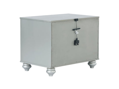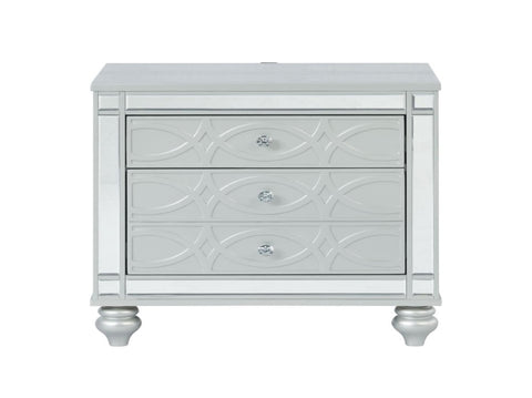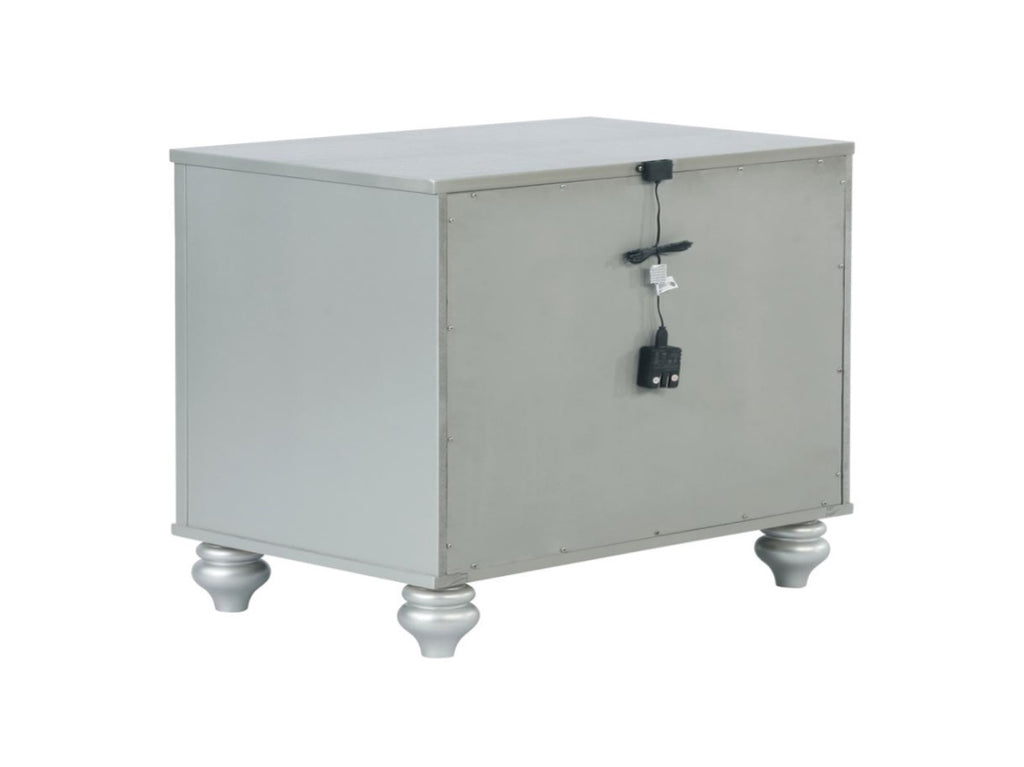 Bring shine and delicacy to your home with this glamorous two-drawer nightstand. It features a glitzy design that draws the eye into any modern home. It's crafted with a vibrant silver metallic finish with fretwork detail on the front panels and drawer fronts. The drawers are adorned with crystal-like pulls and the top one is lined with black felt. Dual USB ports and delicate bun feet complete the design of this exquisite accent piece.