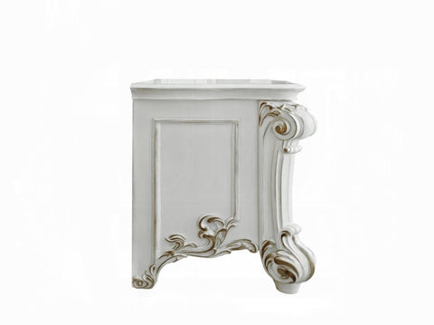 Create the bedroom of your dreams with our nightstand, which includes a magnificent frame that is adorned with stunning floral and scrolled details. This nightstand has elegant hand-brushed gold paired with an antique pearl. This nightstand has 2 drawers that provide plenty of storage space. At the same time, the drawer is a full extension glide drawer.