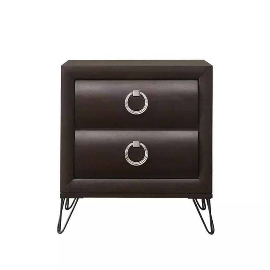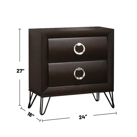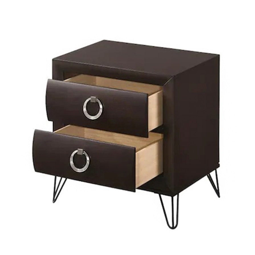 The sleek lines and transitional look of the nightstand make it an ideal addition to any bedroom. This contemporary piece features 2 wooden drawers with curved panels, metal “V” Shaped legs, and a rich dark merlot finish. This 2-drawer nightstand with 6-inch deep drawers offers ample storage for everything from personal essentials to household items.