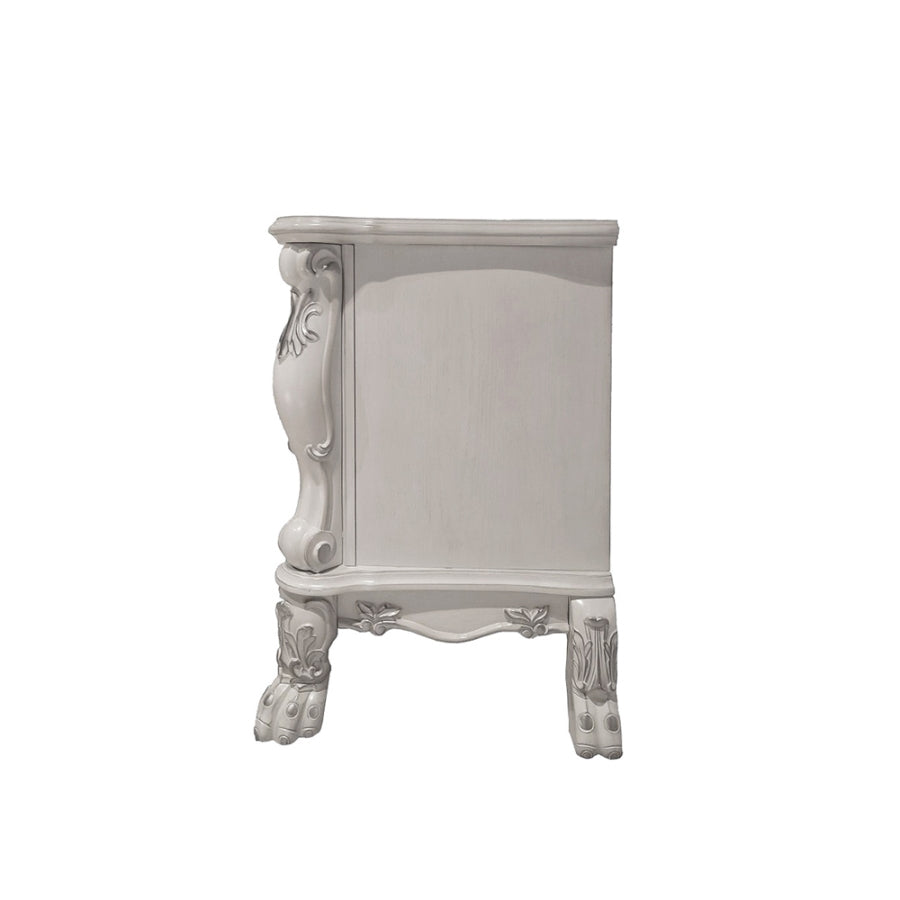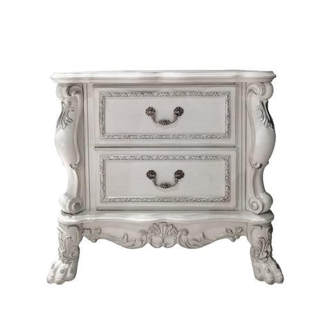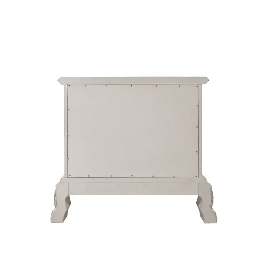 Dressed in an amiable bone white finish, this wooden bedside table features two drawers. Multiple layers of hand-rubbed stains and hand sanding on the finish add to the depth and character of this classic collection. Carefully selected hardwood veneer inlays, rich decorative carvings, and ample space for a master bedroom.