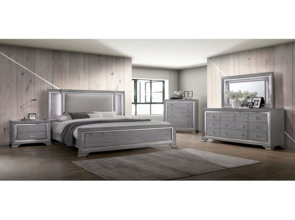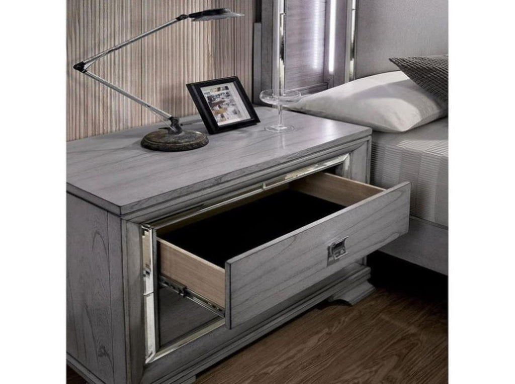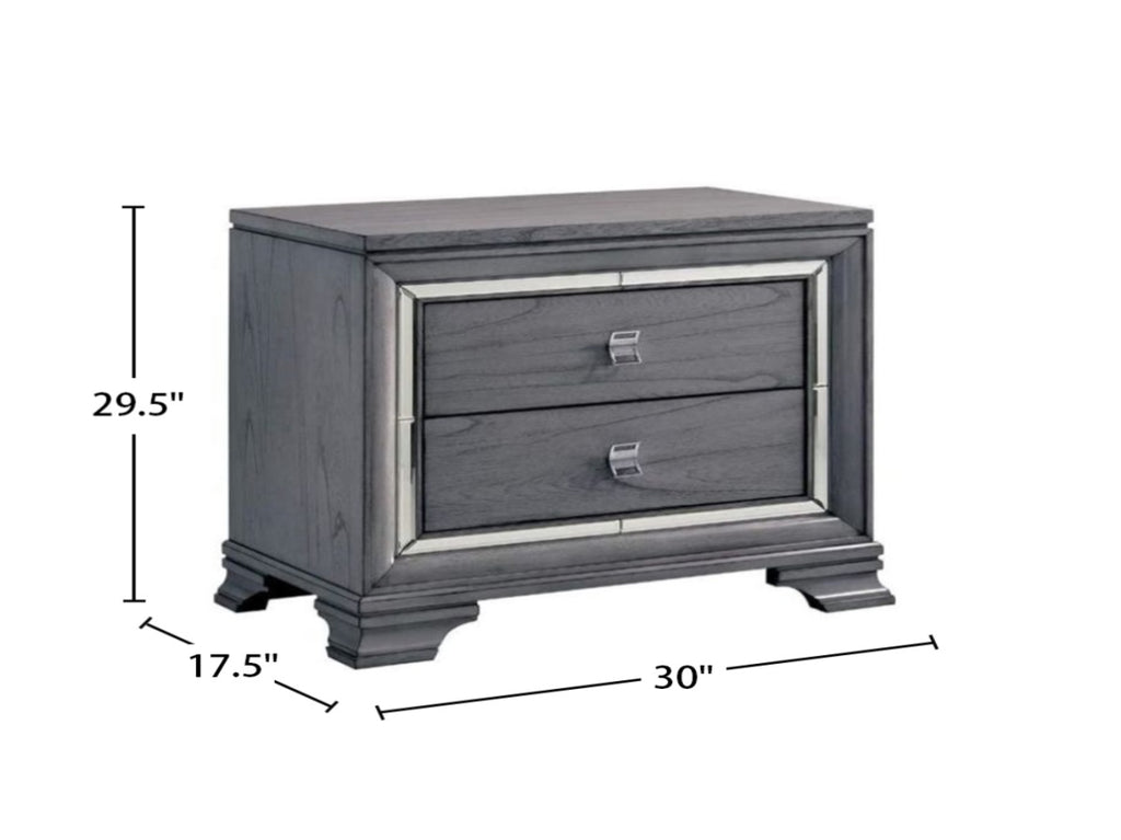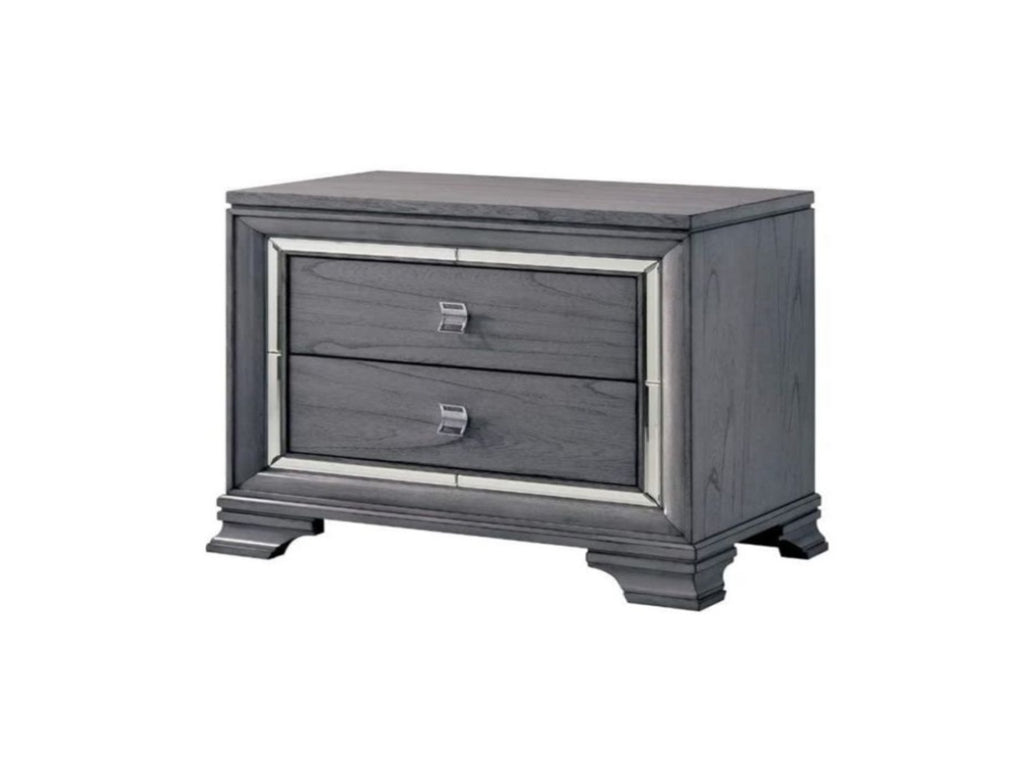 Mirror inserts trim the drawer faces to add an element that plays with lig. Chrome drawer pulls add a level of lightness and stay in the contemporary realm. Featuring a contemporary design with commodious two drawers allows you to reach all important commodities in one go easily. All drawers also feature English dovetail construction. Sturdily made up of solid wood and metal, this nightstand is finished in a light grey color. This simple yet functional nightstand will bring a beautiful accent to any bedroom decor.