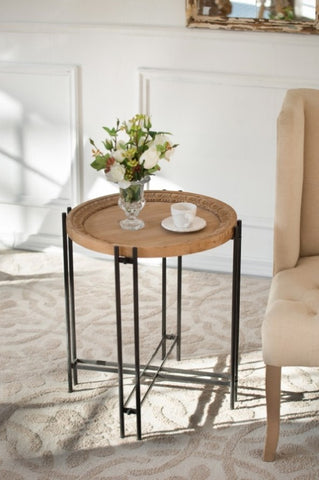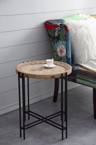 Using pin legs and a large round surface, this modern side table achieves excellent fashion and function with its clever design. A natural wooden tabletop provides a sturdy, attractive surface. Parallel metal legs feature a black finish and form an eye-catching pattern below the wood. The two materials deliver an intriguing contrast while giving this table an appealing contemporary aesthetic.