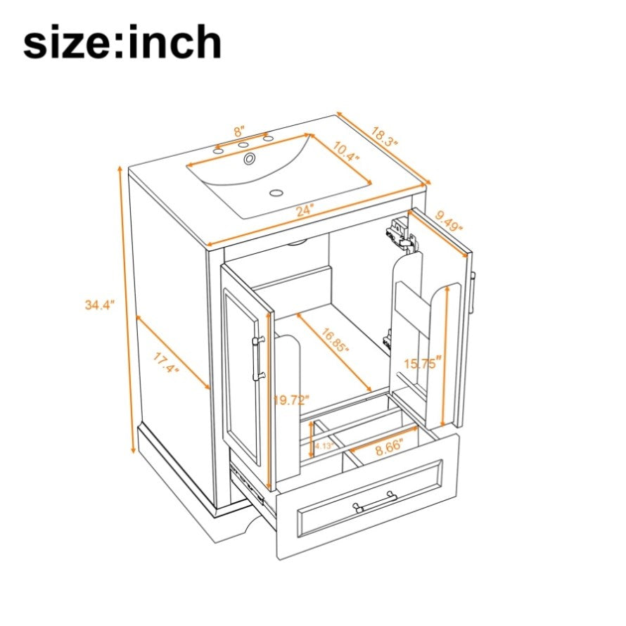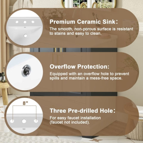 Upgrade your bathroom with this 24" modern vanity featuring a clean black finish and an easy-to-clean ceramic sink. Designed with a divided drawer and two soft-close doors with two double-layer storage racks , it provides smart and organized storage for daily essentials. The soft-close mechanism and smooth design bring a calm, quiet touch to your routine.