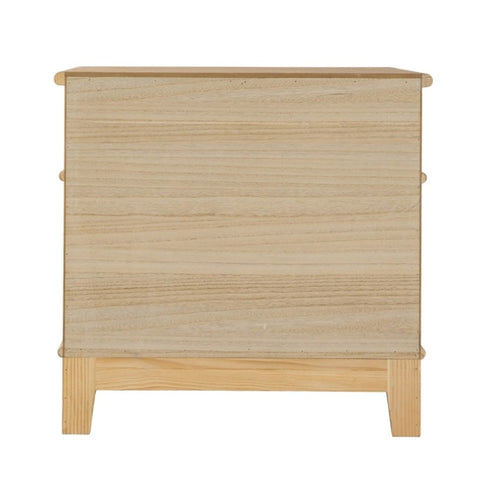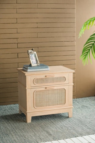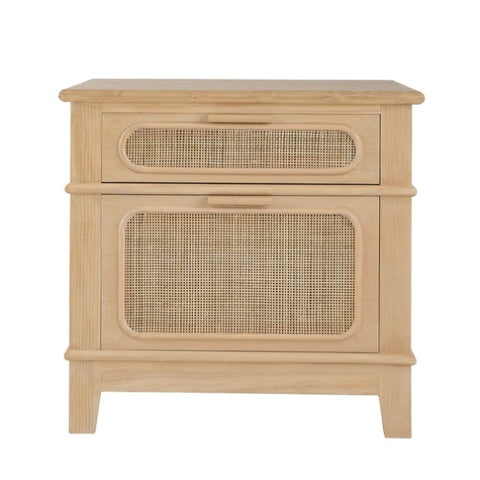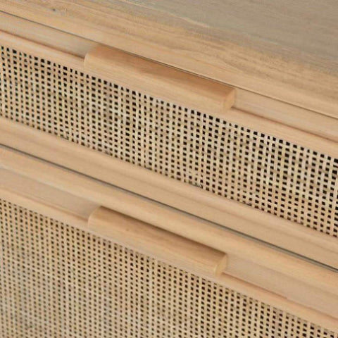 The product offers a light pine wood veener as well as caning inset on the drawers for a bohemian feel with a mid-century flair.