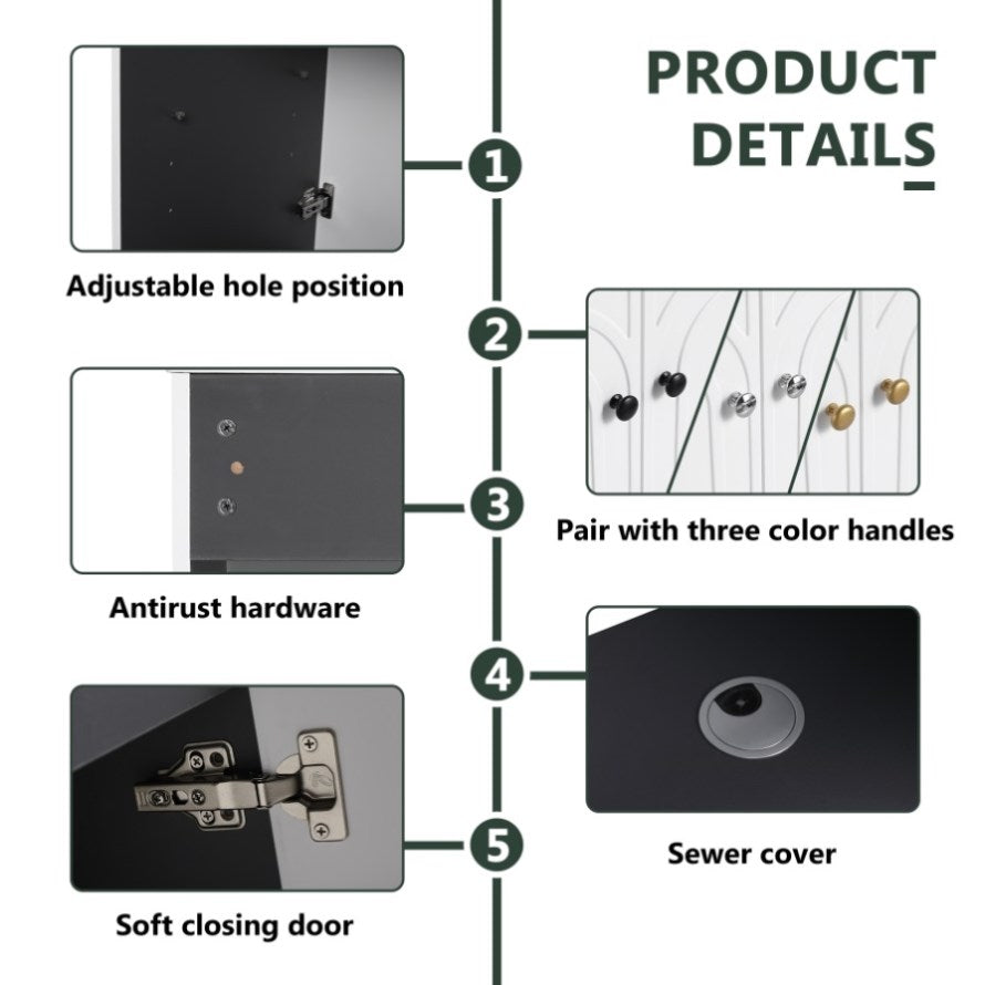 | Package includes | -1x Vanity Cabinet; -1x Adjustable Shelf; -3 Pairs Metal Handle; Parts Package |